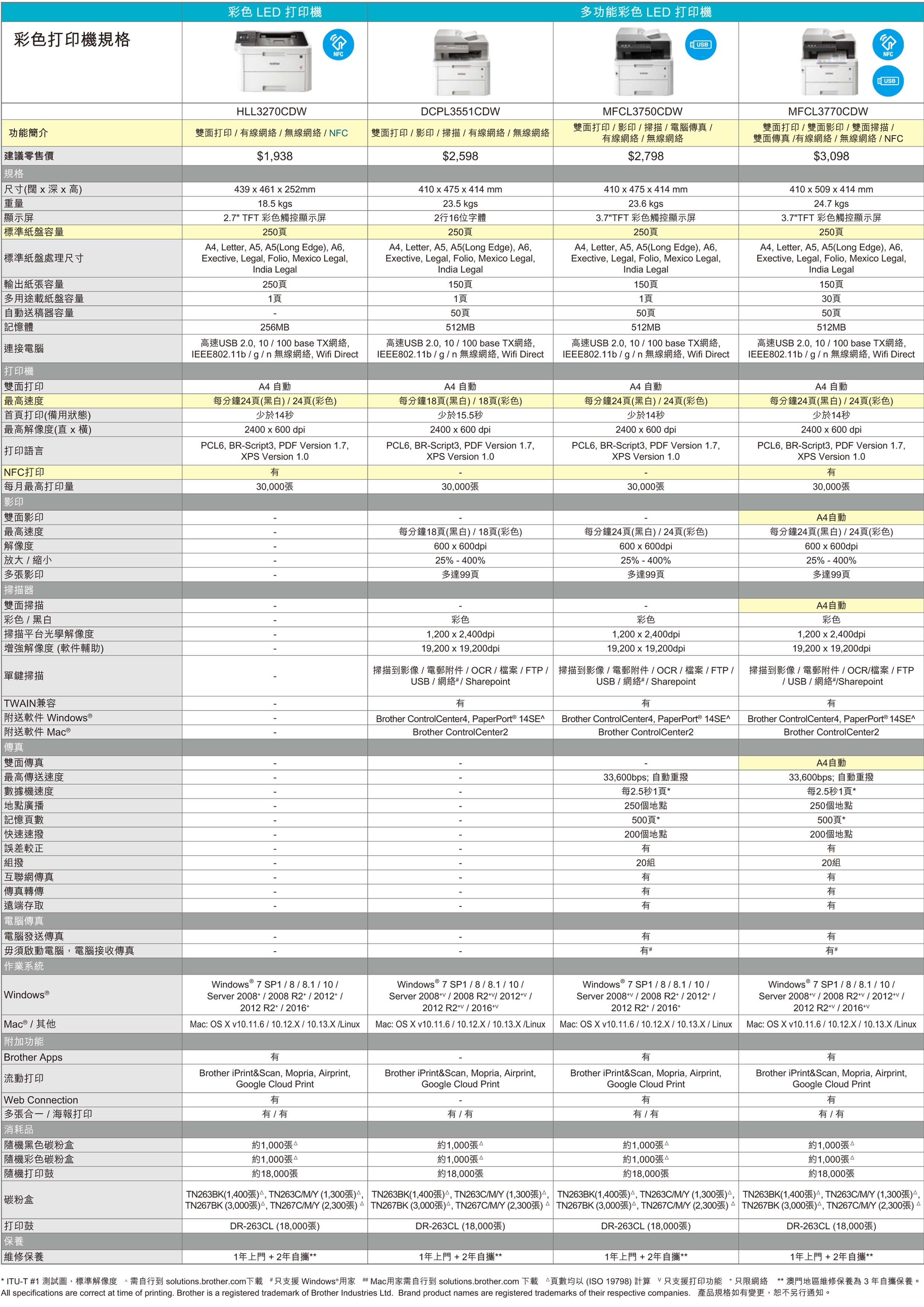 | 功能 | 打印, 影印, 有線網絡, 傳真, 電腦傳真, 無線網絡, 雙面功能及網絡, 彩色掃描, 直接打印, 全自動雙面功能, Google Cloud Print, Apple AirPrint, WiFi Direct |